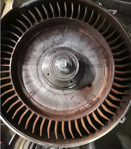 拆開之后,如下圖所示:可以看到內部像是涂了一層東西,而且葉輪外沿有很明顯擦劃的痕跡,把葉輪取下來后,內壁也是同樣的情況。